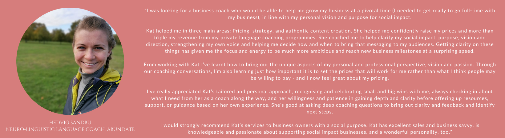 “The best thing is the accountability Kat provides; goals are set or challenges laid down after each session and I couldn’t wait to get started and make progress on them. I ended each call feeling energised and with a clear plan of action! Great for someone like me who tries to do everything at once!